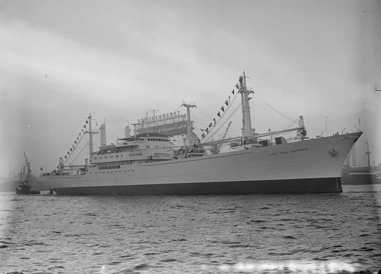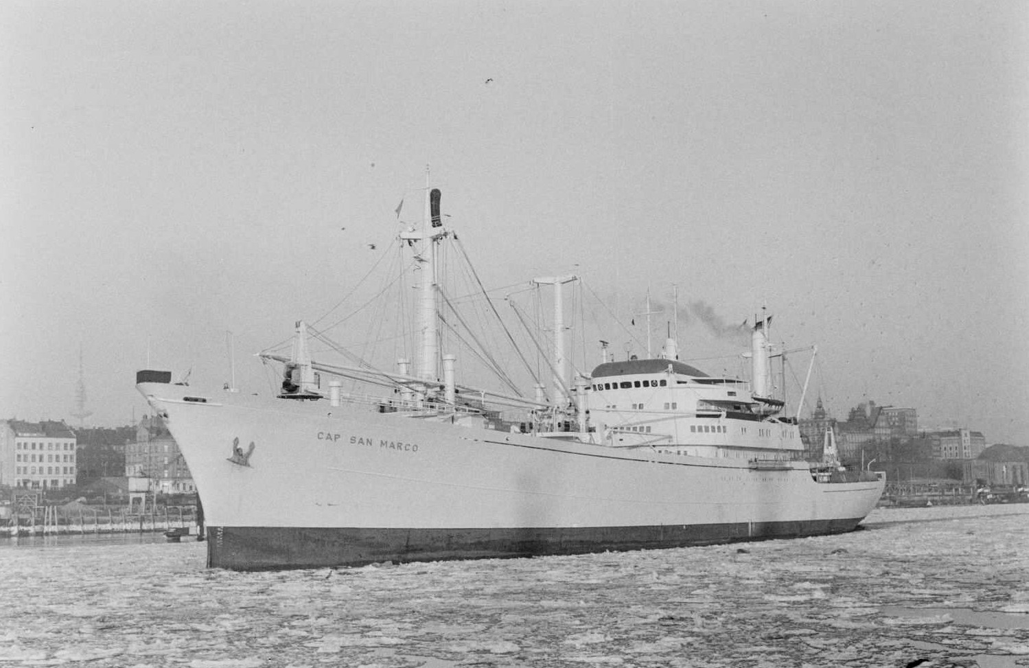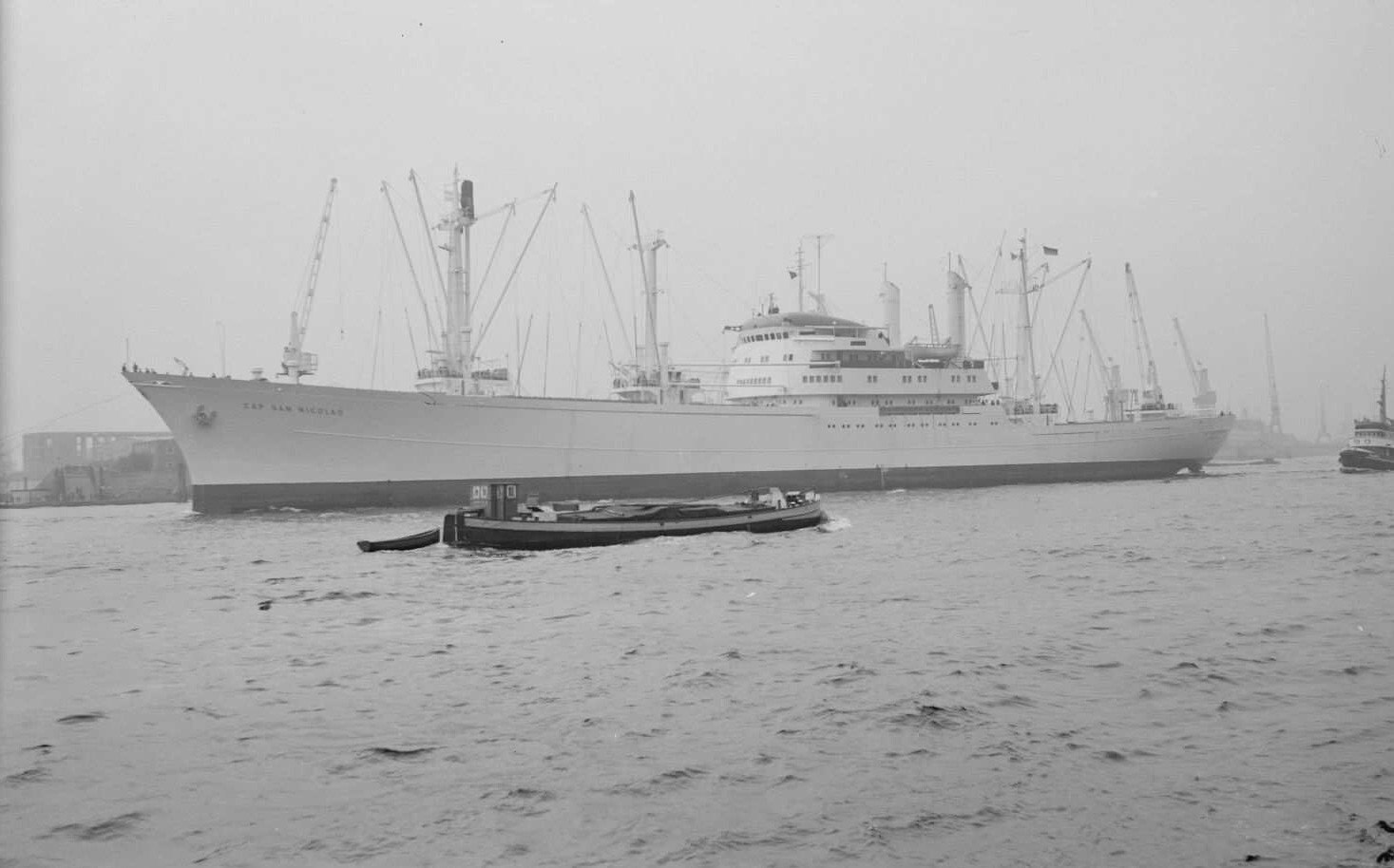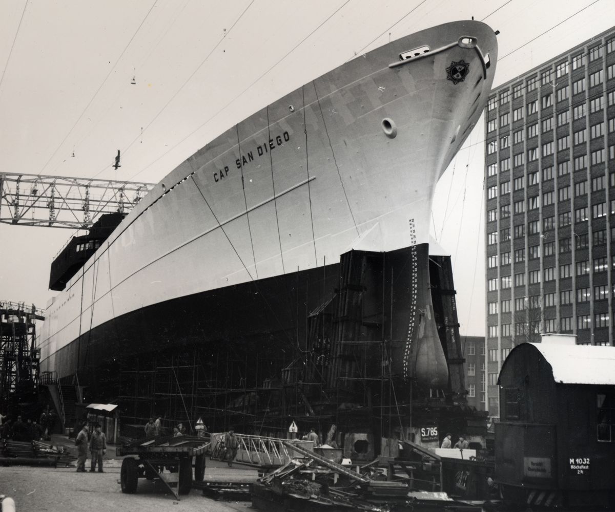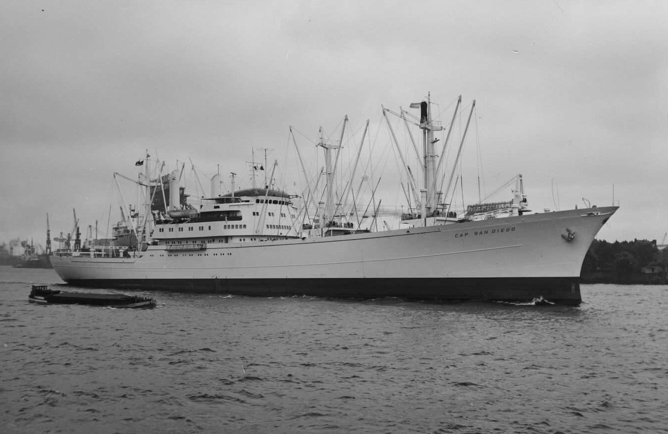 The Cap San Diego was the last of six identical freighters built for the Hamburg South American line between 1961-62 to ply across the North and South Atlantic. They ferried goods, livestock and even 12 passengers each in a very special mixed-use design. Her maiden voyage was to New York on the 29th March 1962, and she sailed regularly from Germany to the Netherlands, Belgium, Brazil and Argentina.