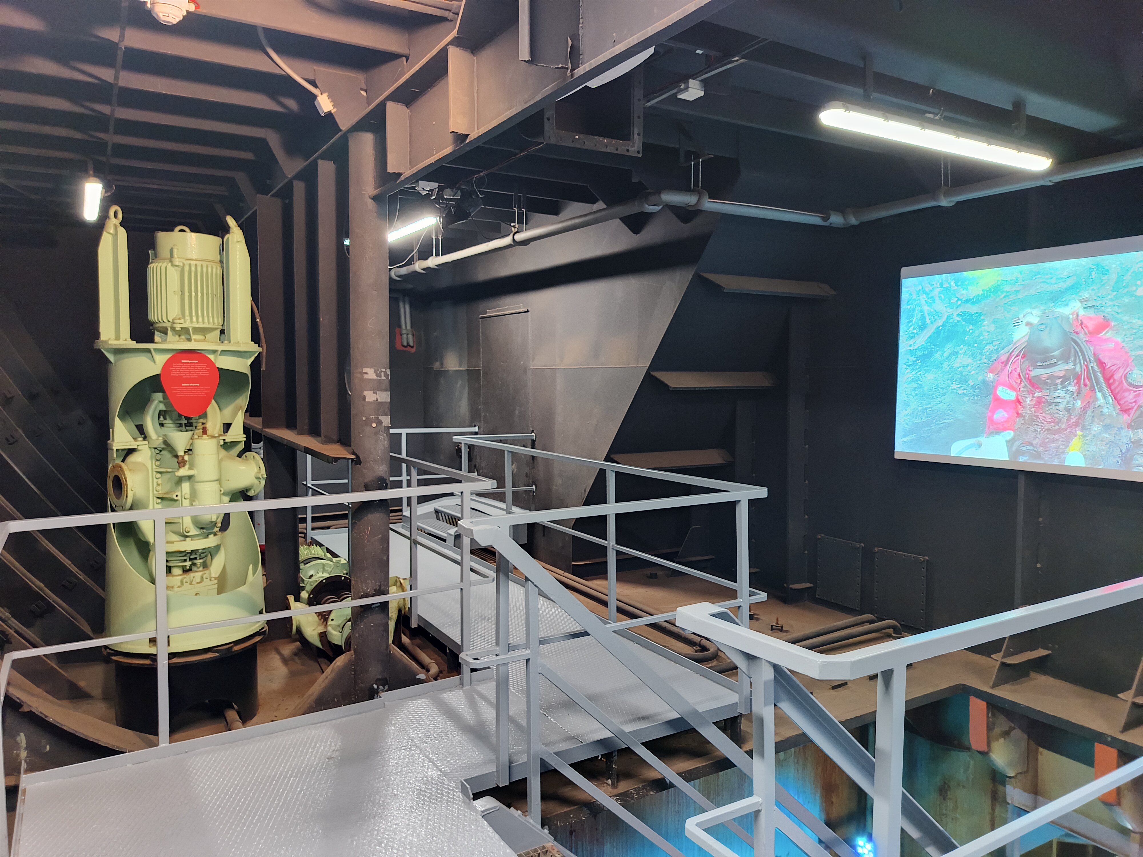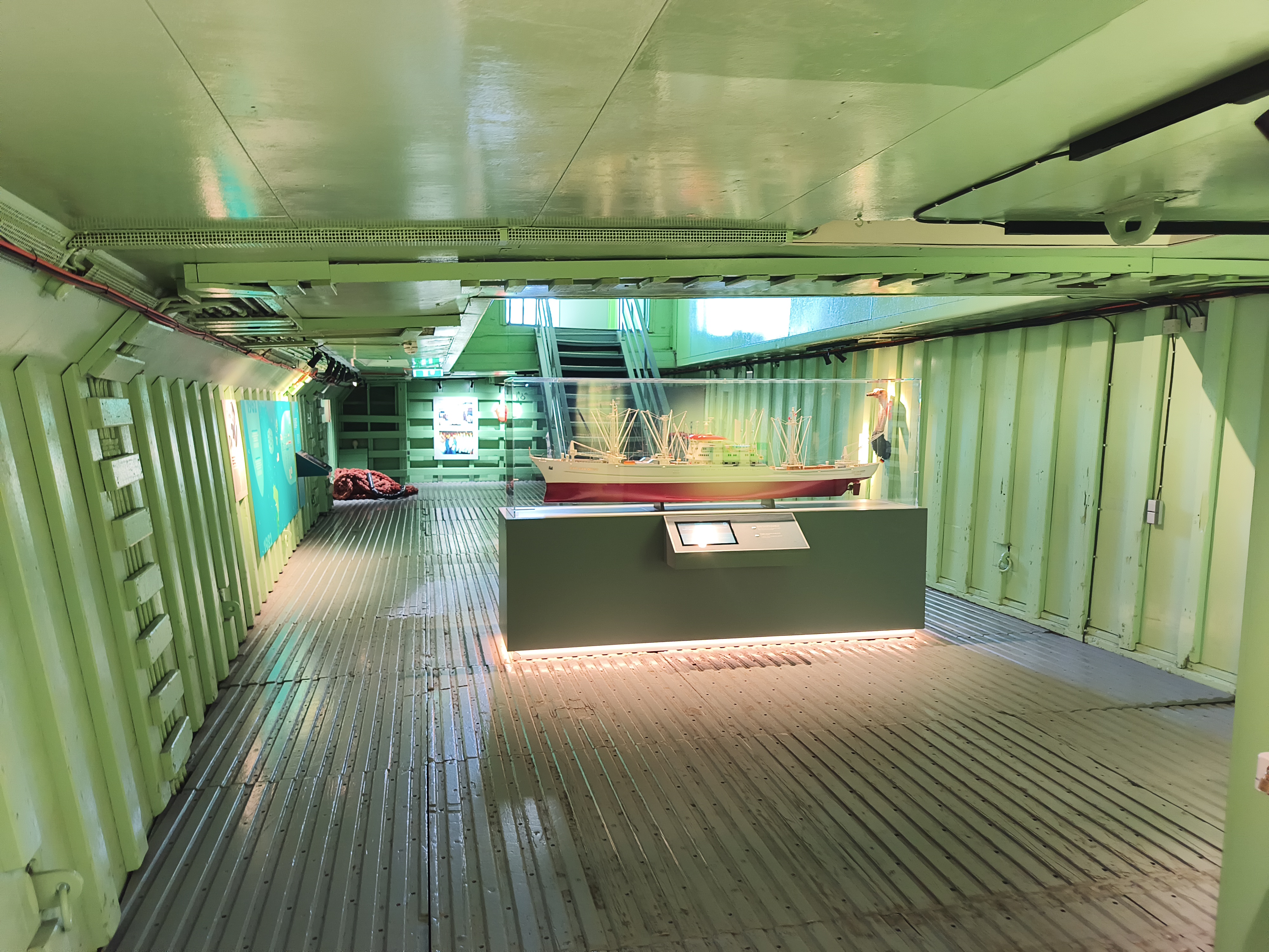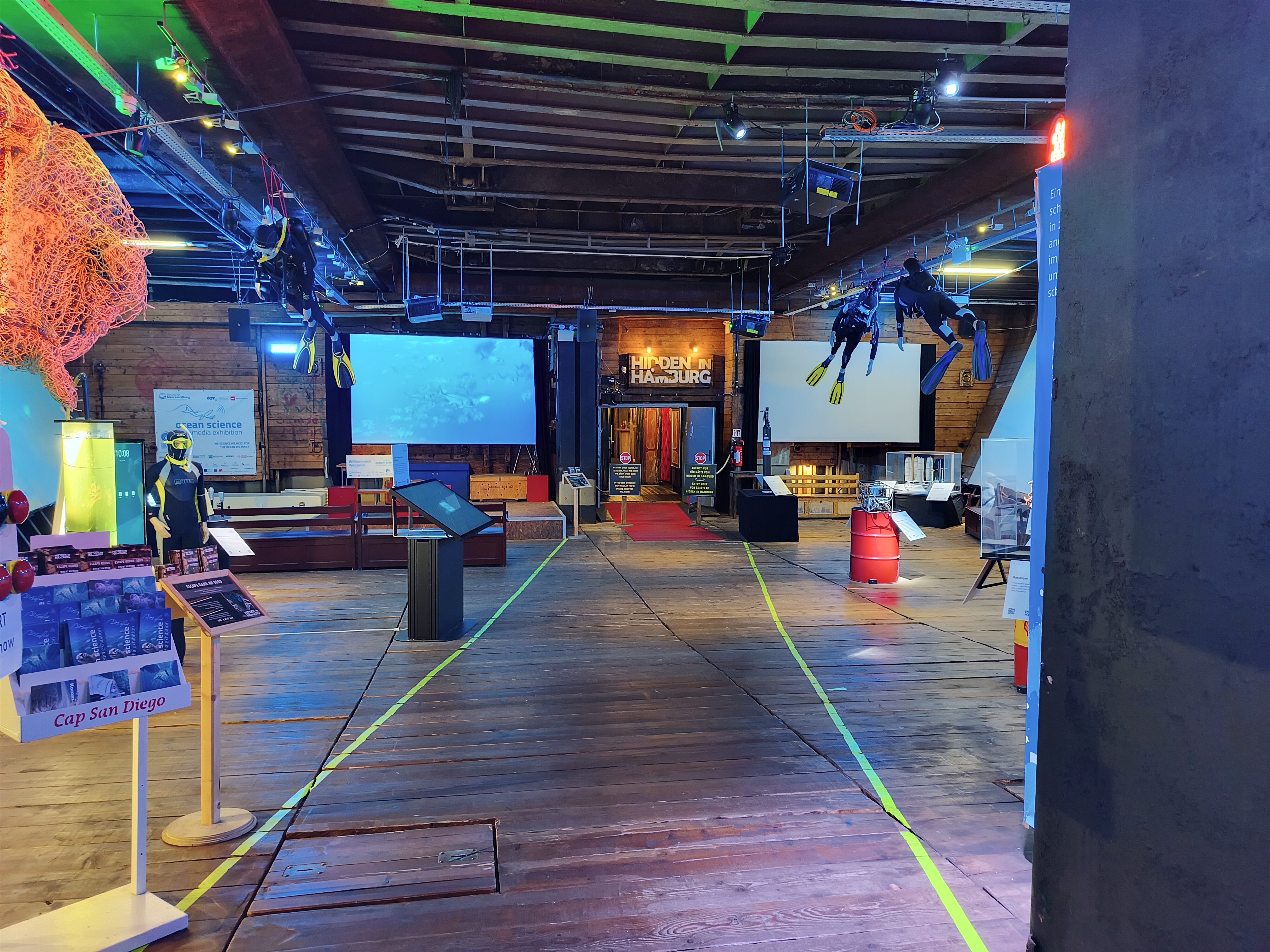 Of course, being built as a freighter at heart meant the Cap San Diego boasts five vast holds – three fore and two aft. The City of Hamburg made the best of every situation by repurposing some entirely, leaving others untouched for authenticity, and having others be event or museum space that could easily be cleared and open when needed. Hold No.5 is fully built up into Hidden In Hamburg, – escape rooms that could bring someone aboard without the least interest in maritime. Before that is a large highy-adaptable events and exhibitions space in Hold No.4. This time the topic was Ocean Science – how we can clean and protect our oceans.