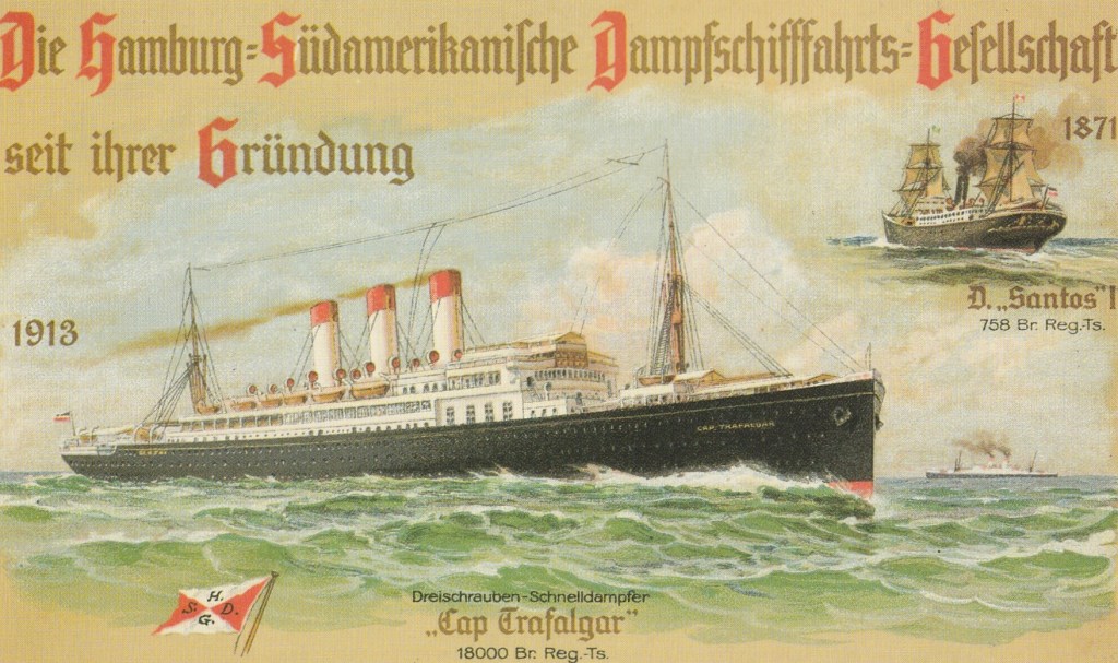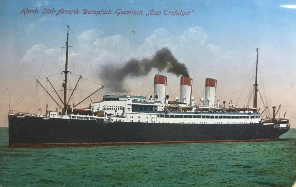 The time certainly was right for Cap Trafalgar to enter service on the La-Plata route with Hamburg Süd in 1914. In 1912, the year had produced “very favourable results”. This year the Hamburg Süd hit a record in terms of passenger numbers carrying an astonishing 82’072 passengers compared to the 43’242 they had carried in 1910. The two Cap sisters would sail as a trio with the Cap Finisterre and could only boost Hamburg Süd’s growth. Another need for these ships was that their new French rival, Compagnie Sudatlantique had in this same year introduced Burdigala, ex-SS Kaiser Friedrich as the first vessel that sailed at 20 knots on the La-Plata route. The Cap Trafalgar commenced service on the 1st of March 1914 after her successful launch on the 31st July 1913, happening at the notable Vulkan Werft, in Bremen with her yard number being 334. The maiden voyage to Buenos Aires was nine days later on the 10th to much fanfare. Commodore Langerhannß was the best candidate as master of the ship, since he had previously commanded the SS Cap Arcona and SS Cap Ortegal.
