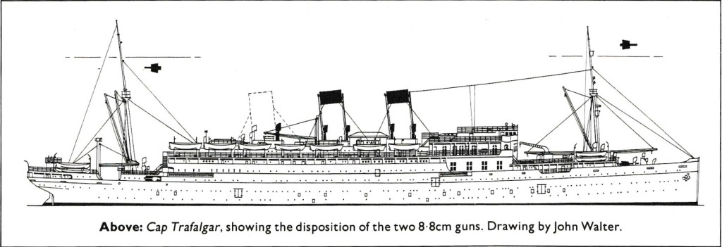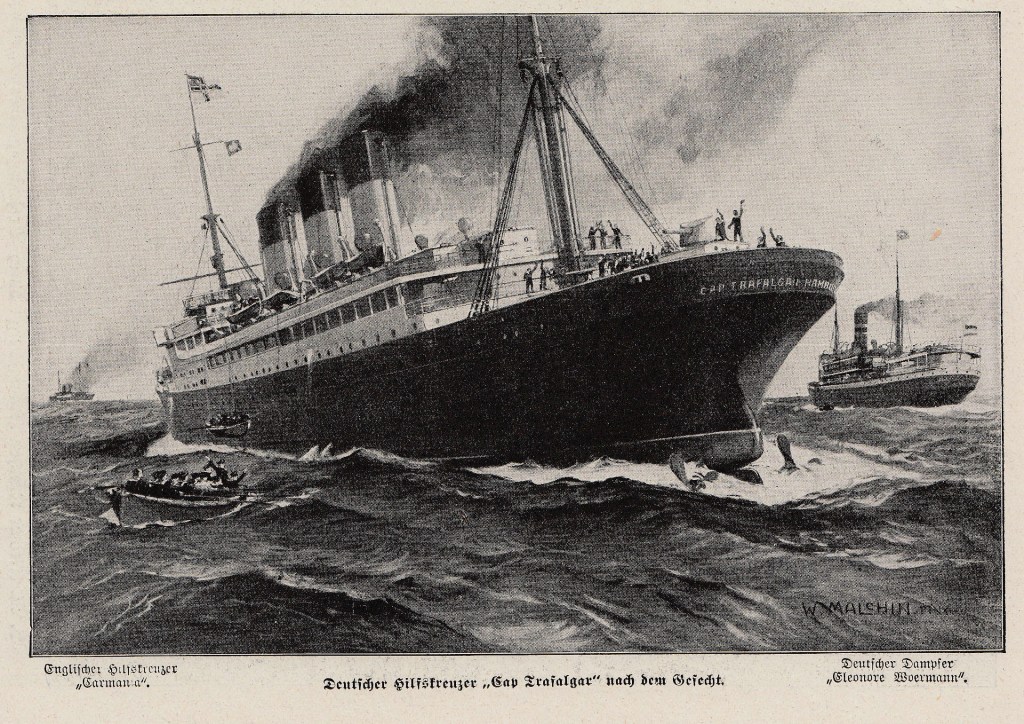 As soon as the First World War broke out, the Cap Trafalgar was in Buenos Aires on another typical voyage and was immediately interned by Argentinian authorities. She was captained by Commodore Langerhans, who had sailed the ship during peacetime. However no contraband or anything of suspicion was found in her holds and she was released despite there being rumours she was carrying extra coal and timber to reinforce her gun positions. The ship left and headed Montevideo on the 17th August where she took aboard 1700 tonnes of coal and sailed again on the 23rd. This was to meet up with with the gunboat Eber to receive her two arms and new leader, Captain Wirth who had necessary military experience. They also met the HAPAG liner Steiermark at the same time presumably to coal. During this meeting the ship’s third dummy funnel was removed to conceal her as a British vessel, as they had very few steamers with three funnels in their fleets. Now as SMS Cap Trafalgar she set out to do the raider’s work of capturing and sinking prizes to aid the war effort, but had no luck. 10 days found nothing in East South America and the ship docked in Ilha da Trinidade to coal again with her two vessels: Eleonore Woermann and Berwind. It was here, awaiting success that the ship would encounter its only fight of her two-week raiding career that spanned from 31st September – 14th August 1914.