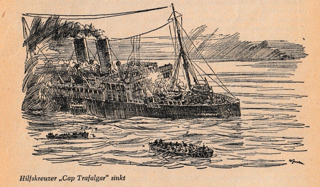 16 sailors went down with the ship, including Captain Wirth. The survivors rowed towards Berwind who had returned. Cap Trafalgar tipped onto her starboard side and sank at an angle. When the funnels reached the water, a colossal amount of black smoke and steam erupted from the ship. She righted herself, now going down at an even keel, as the stern rose up. She rose until the last third of the ship was perfectly straight out of the water, and then went straight down finally. The last thing to be seen above the waterline was the German flag on her stern.