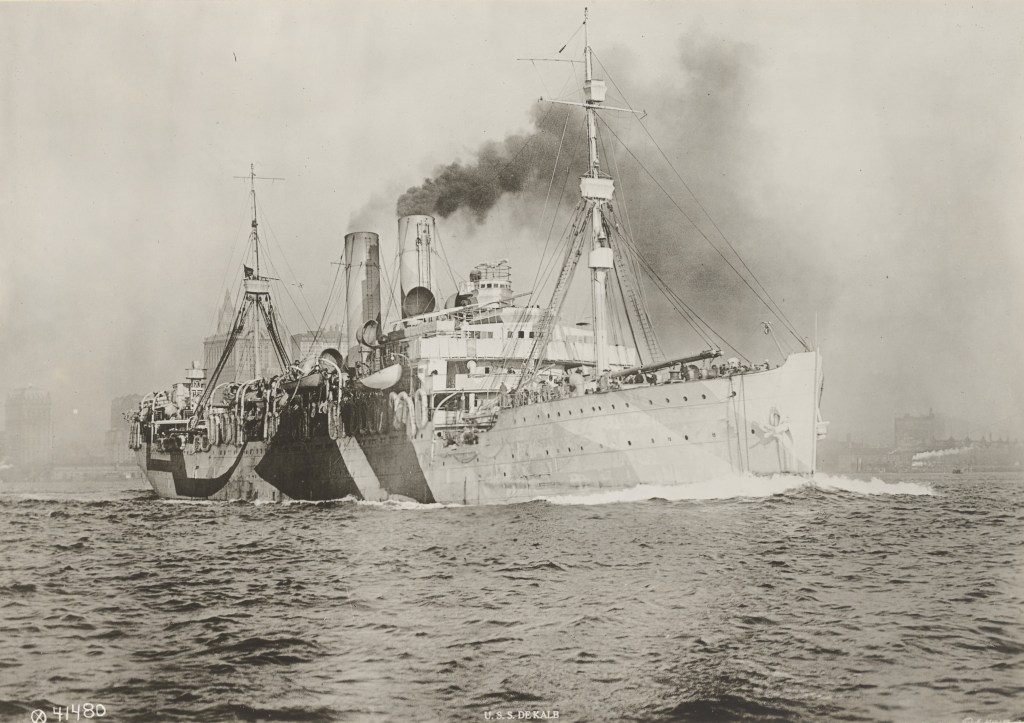 After her conversion, the now American-manned DeKalb conducted her trials and coaling from the 3rd-11th June. She was then assigned to the Cruiser and Transport Force under the command of Rear Admiral Albert Gleaves. She was designated as the escort in charge of two other transports: Henderson and Hancock. The convoy then carried the first units of the American Expeditionary Forces to France with 816 alone aboard the DeKalb.