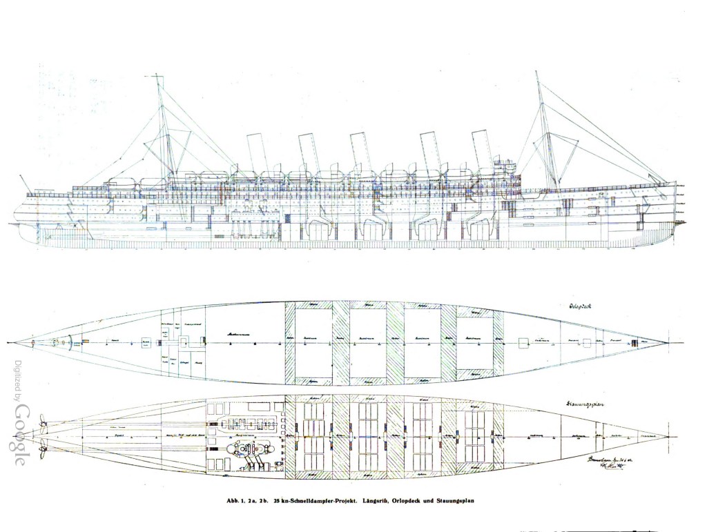 Schütte’s goal was for a liner that could reach an unprecedented 25.5 knots, whilst being the same size and having the same power as the Kaiser Wilhelm II. If it existed this ship would be in a league above any other, sailing a full 2 knots above the fastest ship in the world: the Deutschland with her 23.5 knots. His secret in achieving this lay in the ship having a cruiser stern, shallow draught and a much wider hull which would make her slice through the water like butter using the same engines as her predecessor. With this immense speed, Schütte’s liner could cross the Atlantic in five days compared to the six of her predecessors, which would allow passengers to reach the evening trains in New York, and get connected far faster. This ship would boast an amazing five funnels and a strong resemblance to the Kaiser Wilhelm II, but was different in other substantial ways.
